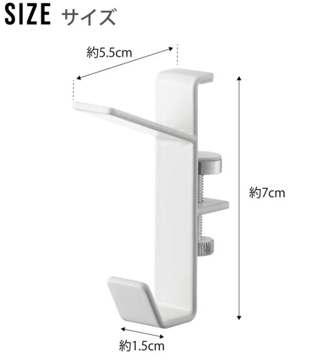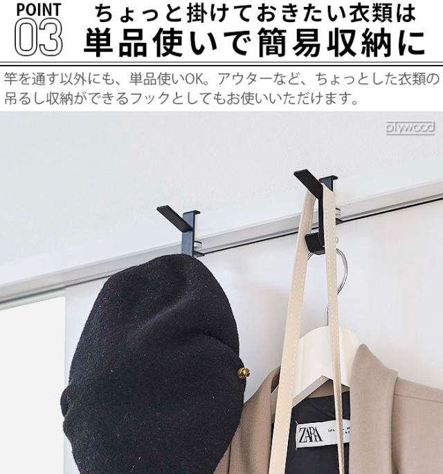 お部屋や浴室扉前の鴨居、窓枠などに取り付けるtowerの物干しフック。2個組になっているので、ふたつを適度な距離にセットして物干し竿を通せば、お部屋のデッドスペースを利用した物干しスペースをちょい足しできちゃいます。洗濯物の干し場はもちろん、単品使いで衣類の収納としてもお使いいただけます。