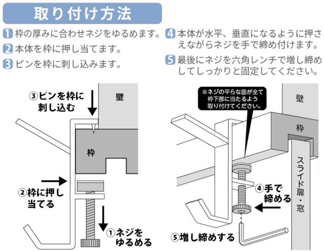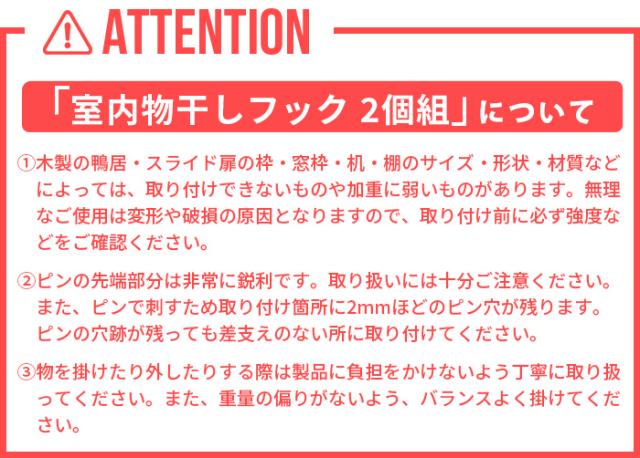 | 木製の鴨居・スライド扉の枠・窓枠・机・棚のサイズ・形状・材質などによっては、取り付けできないものや加重に弱いものがあります。無理なご使用は変形や破損の原因となりますので、取り付け前に必ず強度などをご確認ください。 ピンの先端部分は非常に鋭利です。取り扱いには十分ご注意ください。また、ピンで刺すため取り付け箇所に2mmほどのピン穴が残ります。ピンの穴跡が残っても差支えのない所に取り付けてください。 物を掛けたり外したりする際は製品に負担をかけないよう丁寧に取り扱ってください。また、重量の偏りがないよう、バランスよく掛けてください。 製品を本来の目的以外に使用しないでください。 耐荷重制限は必ずお守りください。 フック部に物干しロープなどを張るようなご使用はお止めください。 |