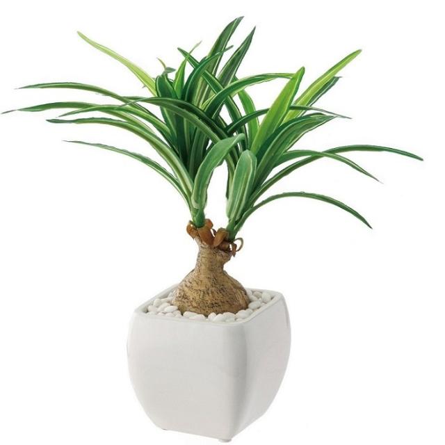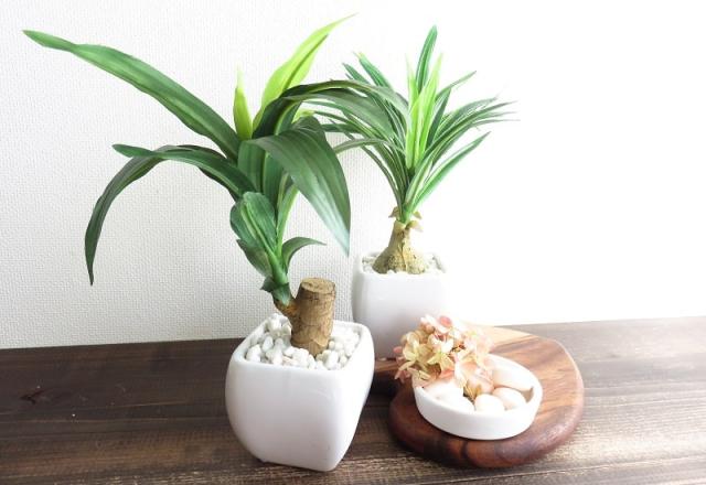 幸福の木として人気のドラセナ、幹がぷっくりと膨らんだユニークなノリナ、それぞれ個性的なフォルムをもつ2種類をご用意。白を基調に爽やかな小石とぷくりとした鉢、特徴的な葉や幹が作り出す美しいフォルムと合わさり、高いデザイン性を生み出す。
