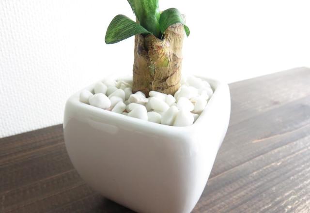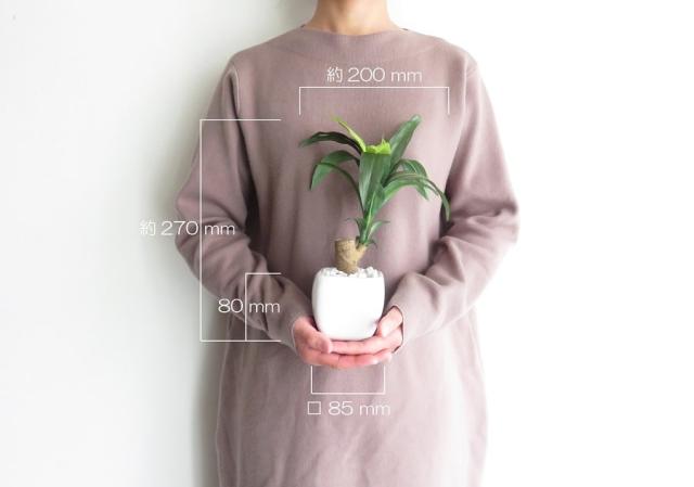 白を基調に爽やかな小石とぷくりとした鉢、特徴的な葉や幹が作り出す美しいフォルムと合わさり、高いデザイン性を生み出す。 |