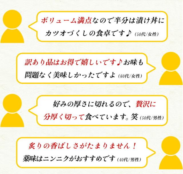 サイズ不揃いの訳あり品だけど、お味は正規品!静岡県焼津港カツオたたきのお得な訳あり品が入荷しました♪皮目を炙った香ばしさともっちりとした食感が特徴で、カツオの風味が口いっぱいに広がります!解凍してお好みの厚さに切り分けるだけで簡単にお召し上がりいただけます♪ショウガ、ニンニク、ミョウガなどの薬味と一緒にお召し上がりいただくのがおすすめです!