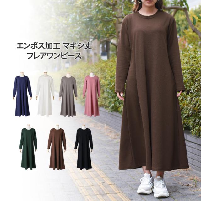 新作 エンボス加工長袖マキシ丈フレアワンピース レディース トップス 秋 長袖 きれいめ 秋冬 ロングワンピース ゆったり 体型カバー Aライン きれいめ 上品 女性 おしゃれ 無地 シンプル カジュアル デイリー
