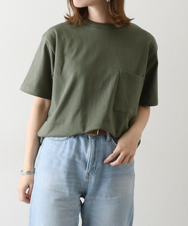 胸元の四角いポケットがシンプルな無地ボディのアクセントとなり、