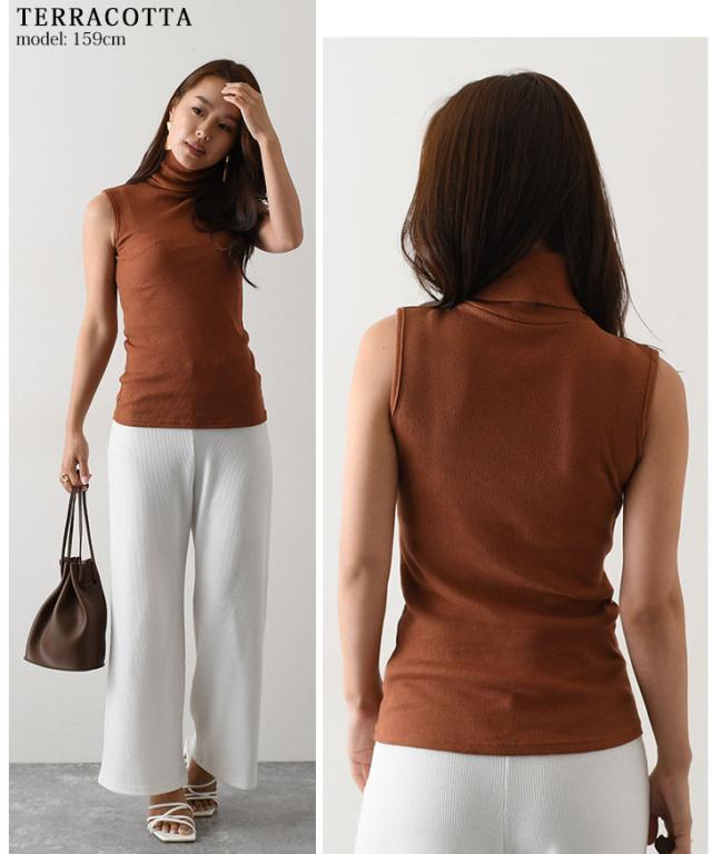 新作 シンプルタートルネックリブノースリーブカットソー 首つまり ハイネック とっくり カットソー リブ 無地 レディース タンクトップ レイヤード シンプル トップス インナー 袖なし 夏 タイト フィット Tシャツ