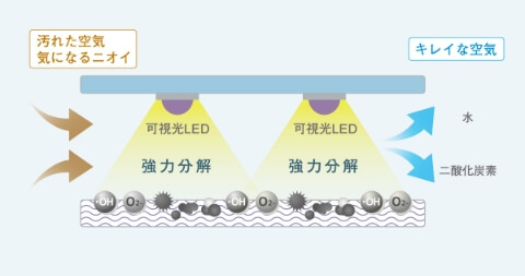 光触媒フィルターに光を照射すると、強力な酸化力が発生します。この酸化力を利用して、空気中の悪臭成分や有害物質などを水と二酸化炭素に分解※できます。