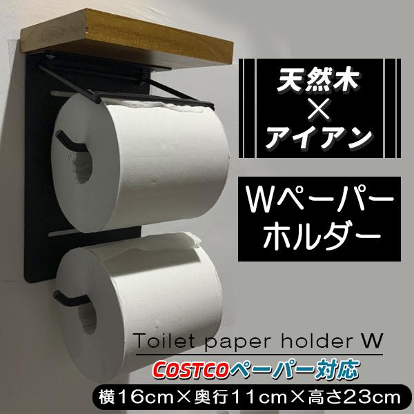 トイレットペーパーホルダー 2連 縦 ペーパーホルダー ウッド アイアン コンビ ダブル ツイン 木製 棚付き 天板 天然木 アンティーク ヴィンテージ