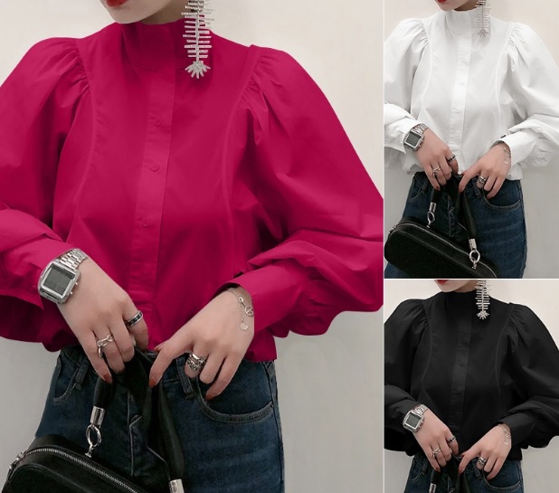 トップス シャツ ブラウス おしゃれ シンプル ゆったり 白 黒 レッド 綿 無地 ハイネック 長袖 バルーン袖 春 秋 大きいサイズ 大人可愛い 10代 20代 30代 お出かけ デート お呼ばれ 通勤 仕事 オフィス OL 上品 トレンド 人気