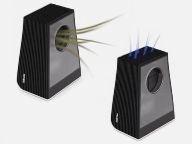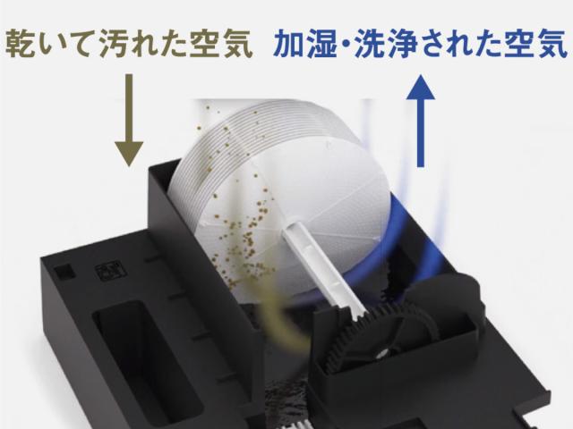 空気中のホコリや微粒子をキャッチする「エバポレーターディスク」と、加湿槽内の雑菌を防ぐ「ウォーターキューブ」を搭載し、水の力を利用して空気洗浄を行います。