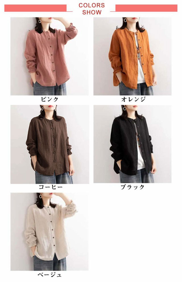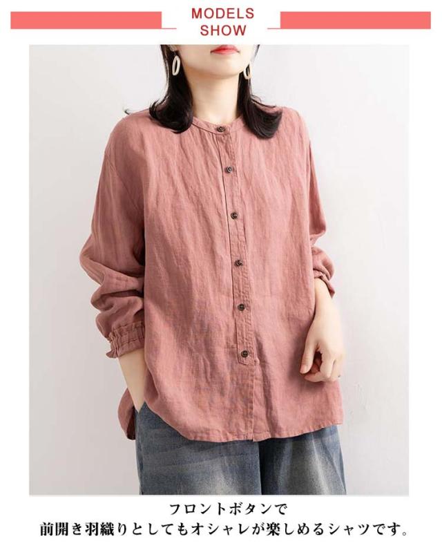 シャツ レディース ブラウス 無地 綿麻 シンプル ボリュームスリーブ キャンディースリーブ リボン リボン袖 長袖 ノーカラー 襟なし シャツチュニック