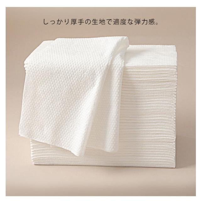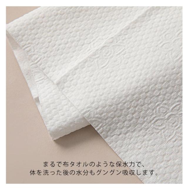 | お肌に優しい使い捨てタオル しっかり厚手の生地で適度な弾力感。 まるで布タオルのような保水力で、体を洗った後の水分もグングン吸収します。 肌当たりが優しいため、毎日安心して使えます。 絞っても破れず丈夫なため、水拭きにも使える優れもの。 バッグやポーチにすっぽり収まる大きさなので、旅行や出張など、外出先で便利です。 全身に使える大きいサイズです。来客用のバスタオルとしてもおすすめ。 | |