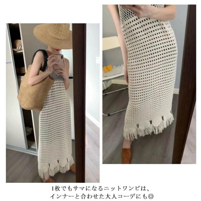 透かし編み ワンピース レディース キャミワンピース ノースリーブ ロングワンピース Vネック サマーニット ニットワンピ フリンジ 春 夏 メッシュニットワンピース 涼やか 透かし編み ペチワンピ レイヤード 大人 ゆったり かわいい カジュアル 夏 夏物 夏服 送料無料