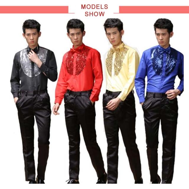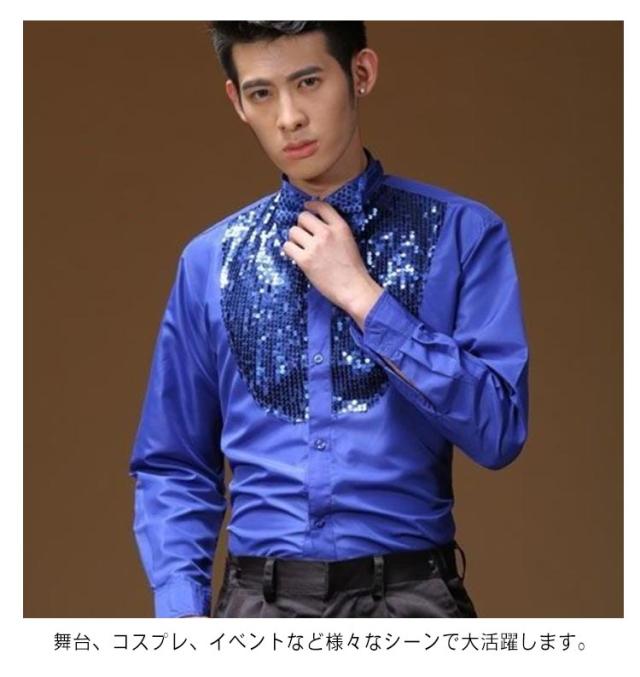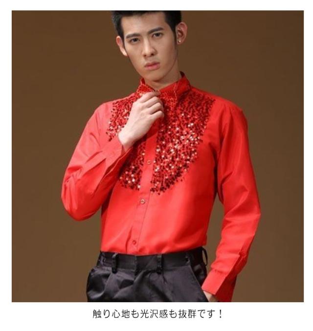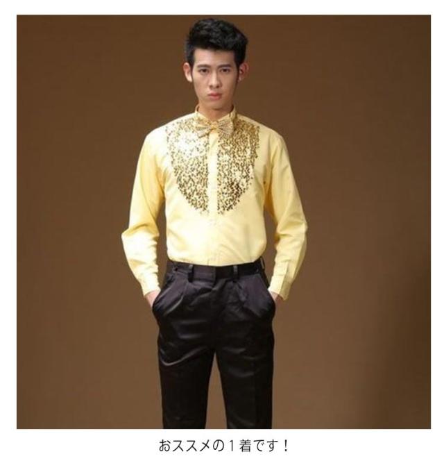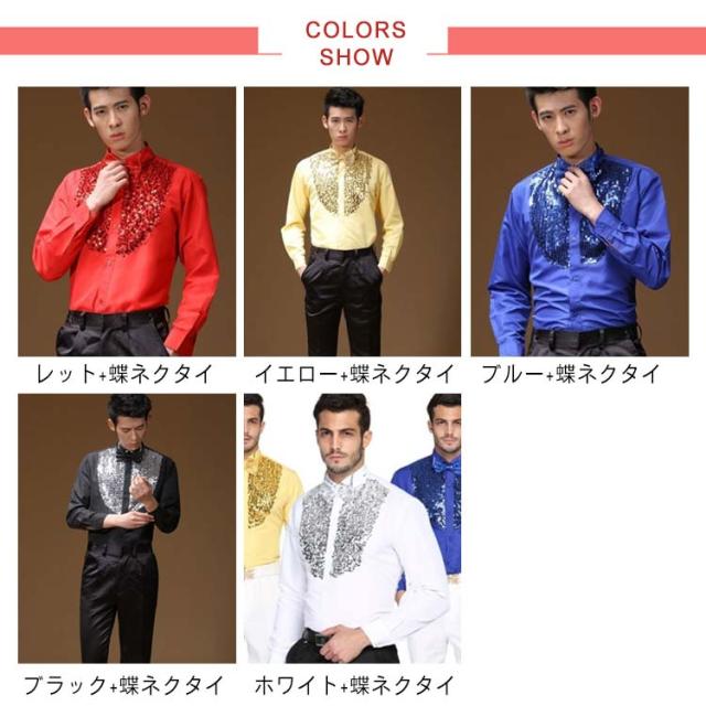 サテンシャツ メンズ 長袖 シャツ 蝶ネクタイ付き スパンコール カラバリシャツ 社交ダンス パーティー ダンス 衣装 ダンス衣装 ステージ衣装 舞台衣装 光沢 司会者 礼服 写真撮影 パーティー