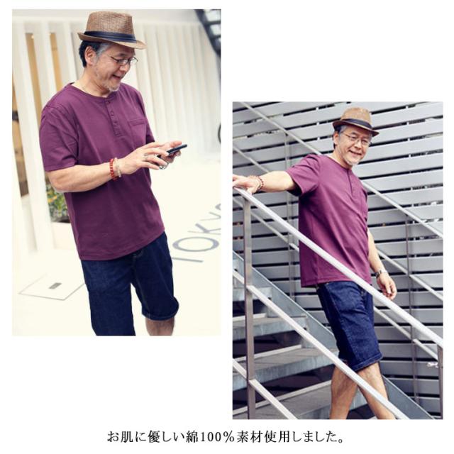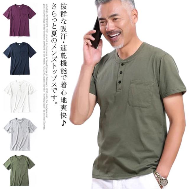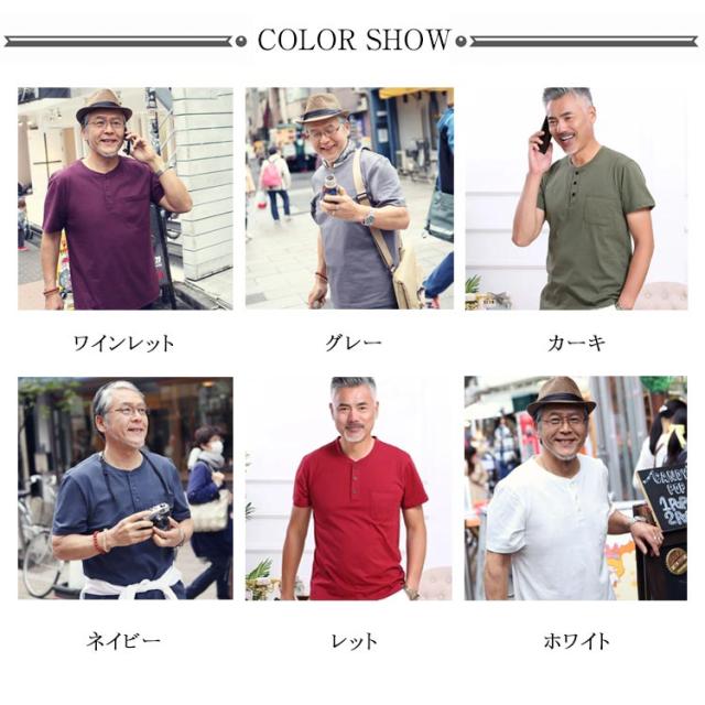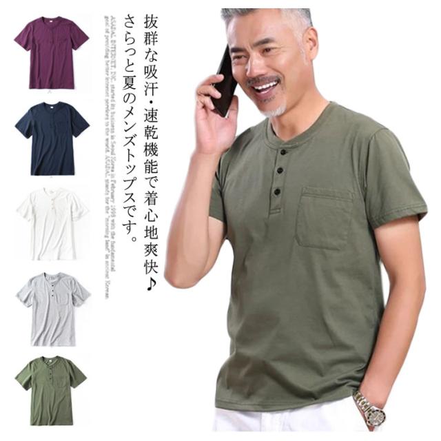 へンリーネック tシャツ メンズ 半袖Tシャツ 綿100% 無地 ワインレット グレー カーキ ネイビー レット ホワイト 半袖 夏 パジャマ メンズ お誕生日 プレゼント 内祝い 父 ギフト 敬老の日