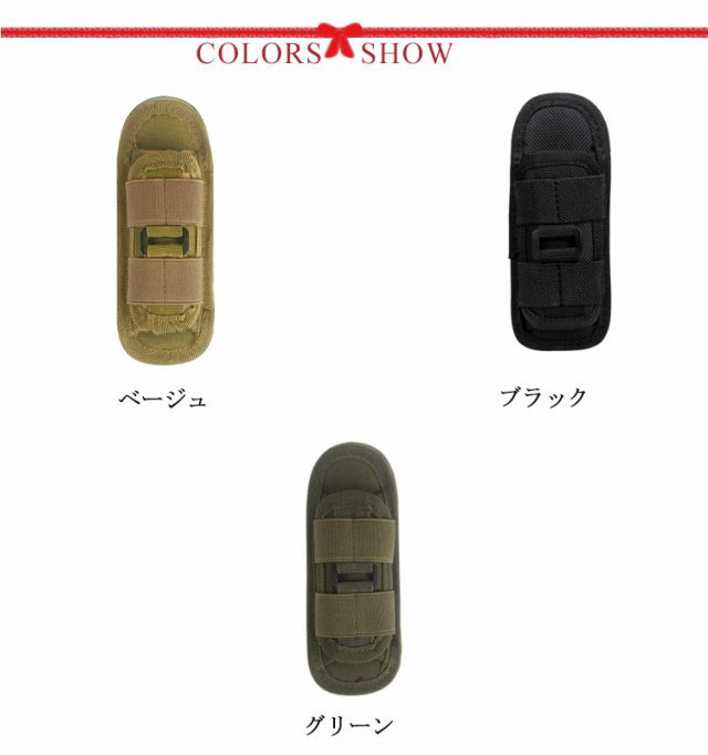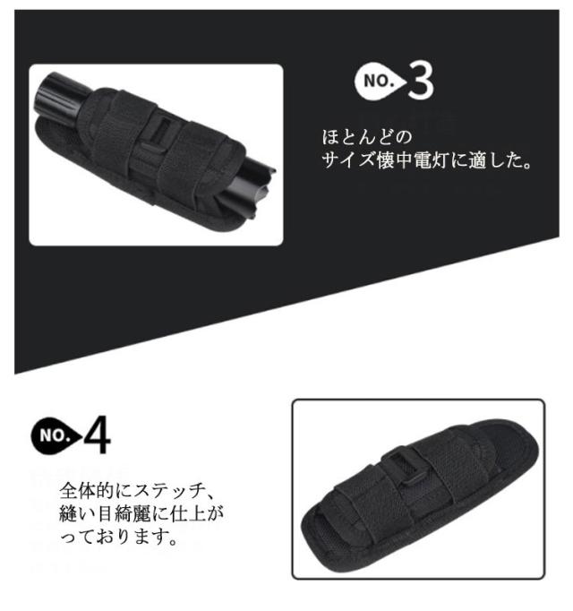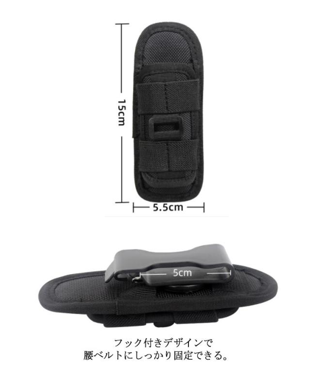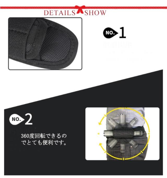 | 懐中電灯ホルダー ナイロン素材を採用して、防水、耐摩耗性、通気性に優れています。 360度回転できるのでとても便利です。 ほとんどのサイズ懐中電灯に適した。 全体的にステッチ、縫い目綺麗に仕上がっております。 フック付きデザインで腰ベルトにしっかり固定できる。 | |