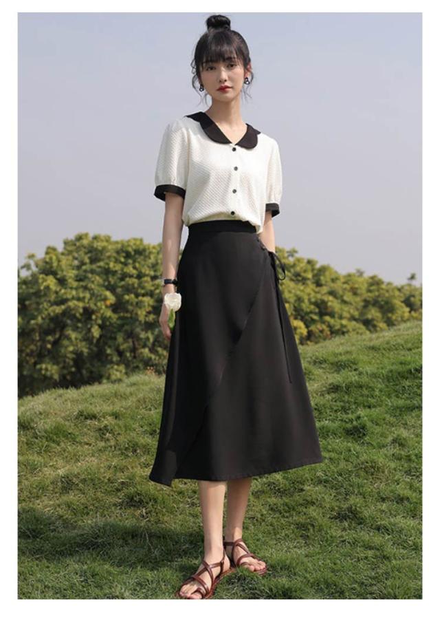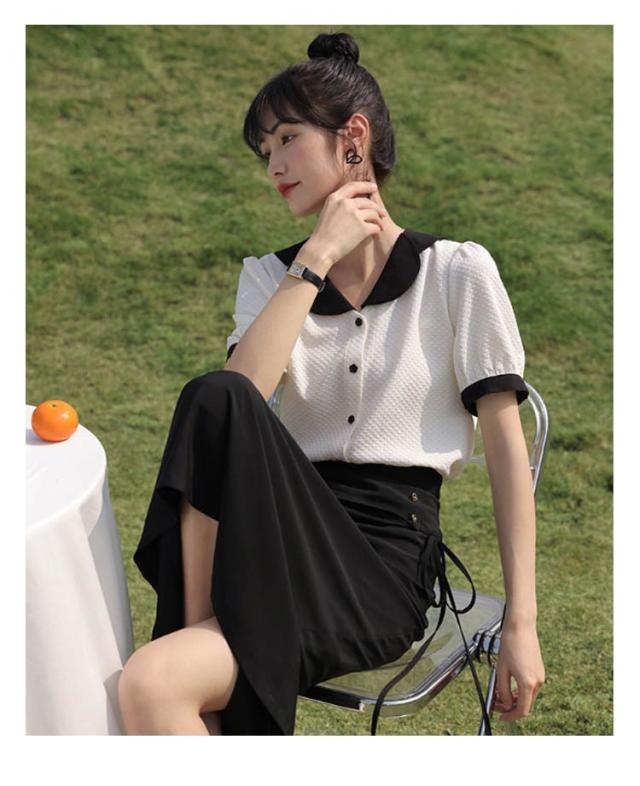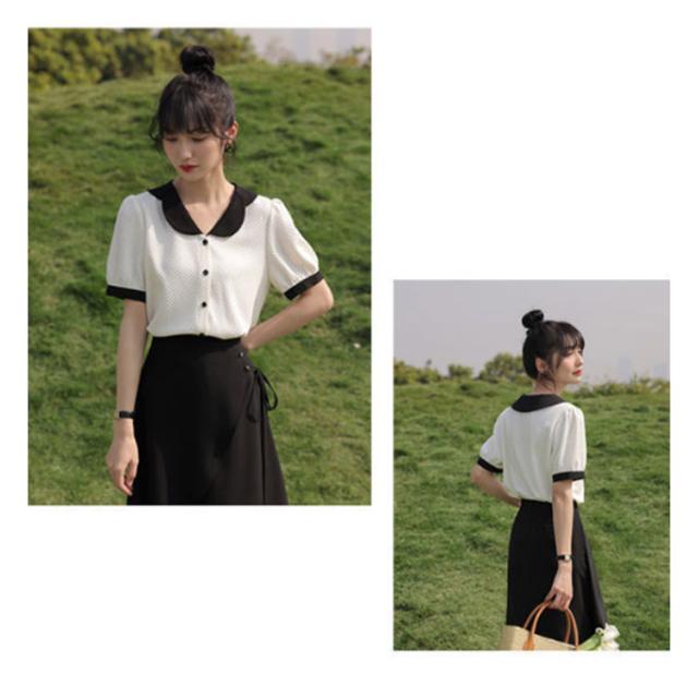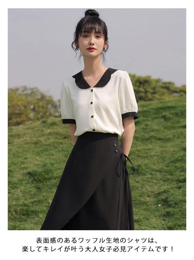 シャツ レディース 開襟シャツ 半袖 ワッフル生地 トップス 配色 襟 袖口 バイカラー 配色 ブラウス 丸襟 大きいサイズ 無地 シンプル カジュアル きれいめ フォーマル オフィス OL ビジネス 結婚式 冠婚葬祭 夏 春 夏服 送料無料