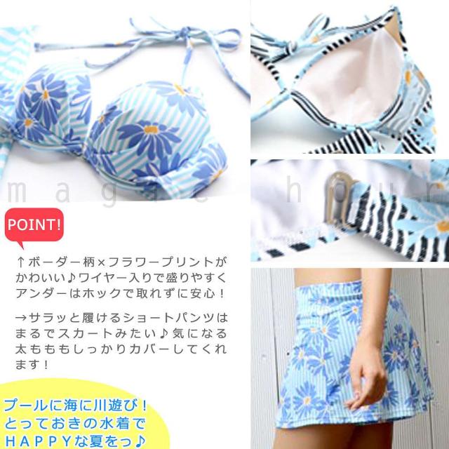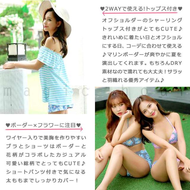 ボーダー柄にトロピカルフラワーが可愛いスイムウェア! 今期大注目のオフショルダーとしても使える2WAYシャーリングトップス付きのお得な4点セット。 トップスとショートパンツ付きで二の腕や気になるお腹周りをお洒落にカバーアップ♪ クイックドライ(速乾生地)なので水陸両用で使えます! 着心地が良く、動きやすい伸縮性抜群の生地を使用。 スイミング、水中ウォーキングやエアロビクスはもちろんヨガや室内のスポーツにも♪ 露出が気になる方やママにも嬉しいセットになっています♪ 立体成型ブラ パッドポケット ワイヤー入り アンダーバストホック仕様 |