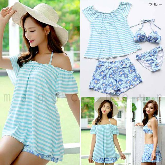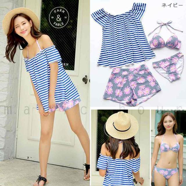 水着 レディース オフショル ビキニ タンキニ 体型カバー 4点 セット セパレート ホルターネック ボーダー 花柄 大きいサイズ フィットネス 短パン Tシャツ