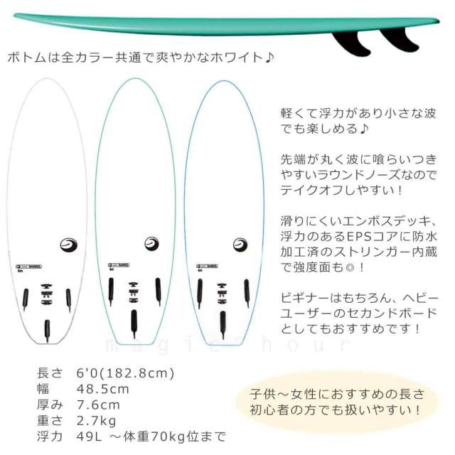 サーフボード ソフトボード 6’0 ショートボード ファンボード サーフィン 初心者 子供 メンズ レディース 3フィン トライフィン balibarrel ホワイト ブルー