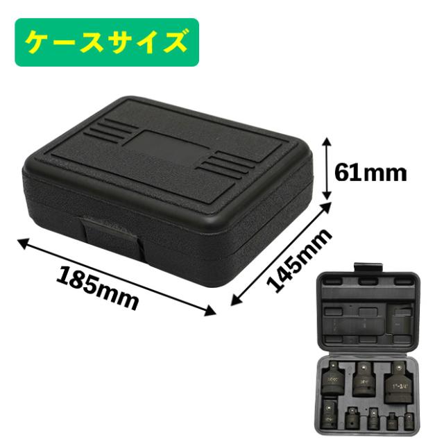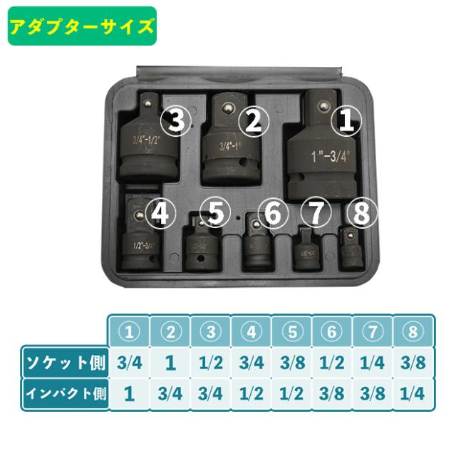 | セット内容 | ●<インパクト側>1インチ⇔<ソケット側>3/4インチ ●<インパクト側>3/4インチ⇔<ソケット側>1インチ ●<インパクト側>3/4インチ⇔<ソケット側>1/2インチ ●<インパクト側>1/2インチ⇔<ソケット側>3/4インチ ●<インパクト側>1/2インチ⇔<ソケット側>3/8インチ ●<インパクト側>3/8インチ⇔<ソケット側>1/2インチ ●<インパクト側>3/8インチ⇔<ソケット側>1/4インチ ●<インパクト側>1/4インチ⇔<ソケット側>3/8インチ ●専用ケース×1個 |
