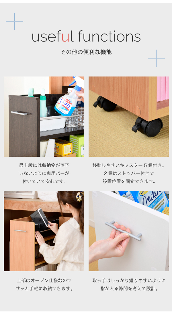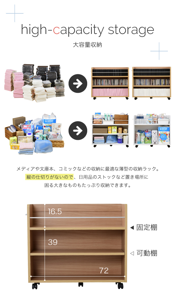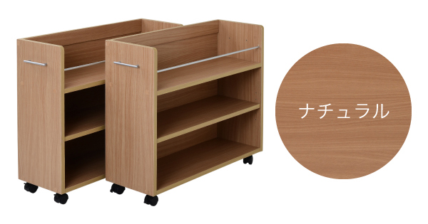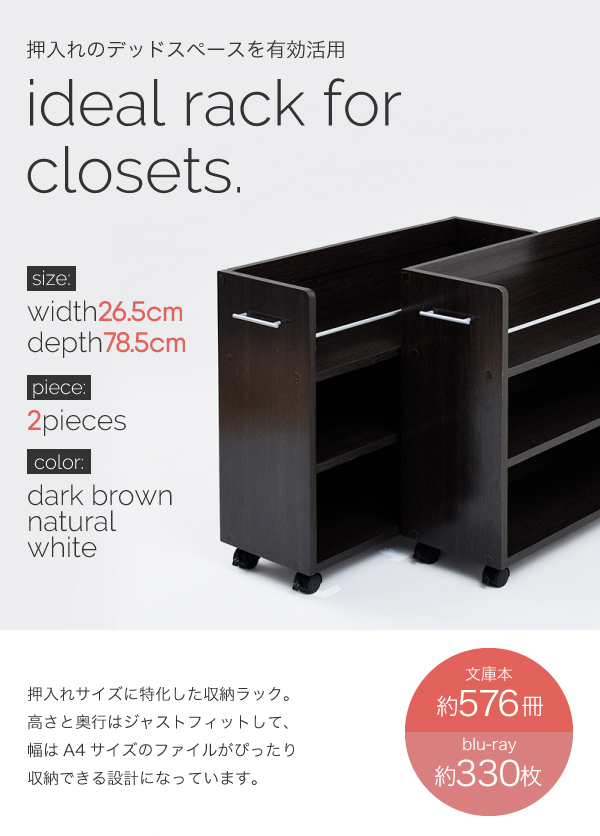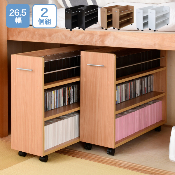 キャスター付きの便利な押入れラック2個組。取っ手はどちらにも取り付け可能なので、収納箇所の向きは左右入れ替えできます。A4ファイルがぴったり収納できるよう設計された幅26.5cm。本やメディア類や、日用品のストックなどの収納にぴったり。押入れ内のスペースを有効活用するのでお部屋をすっきり片付けられます。