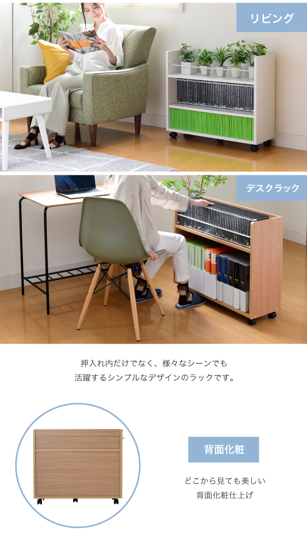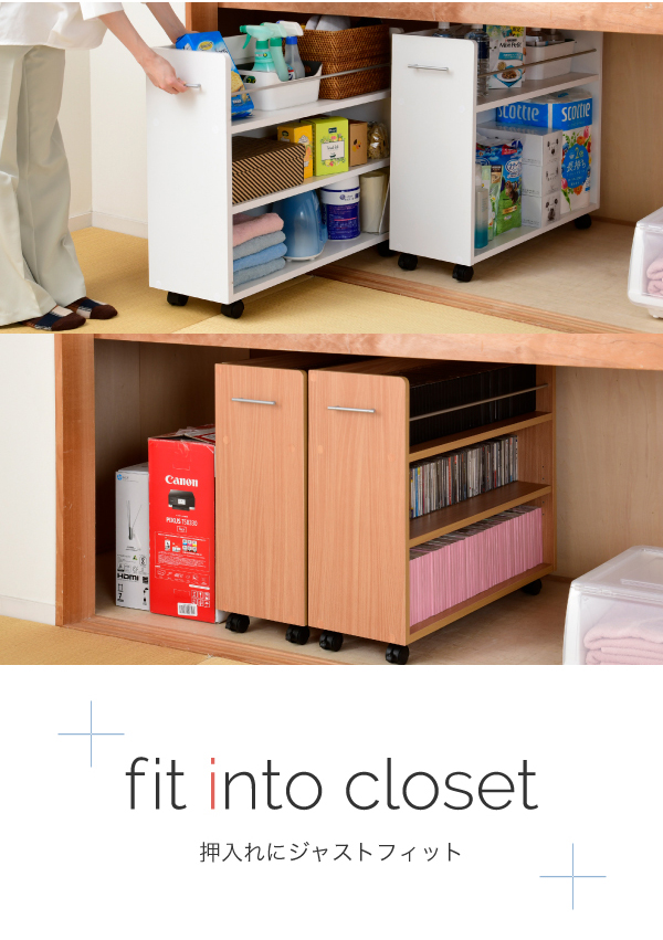 押入れにぴったり入る、キャスター付きラック2個組。押入れ内のスペースを有効活用して、A4ファイルやメディア、日用品を収納できます!