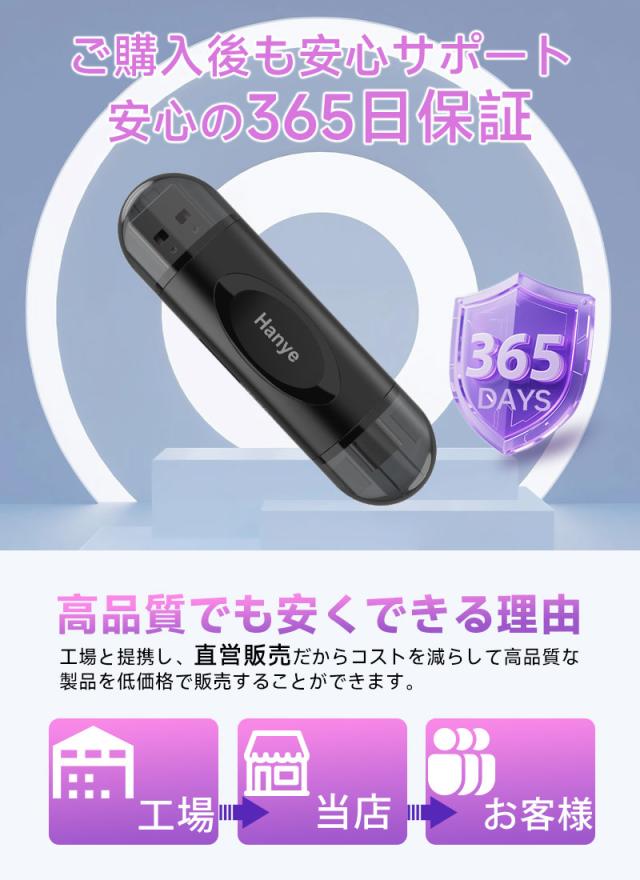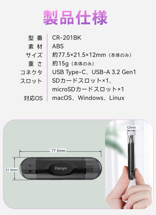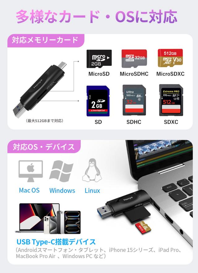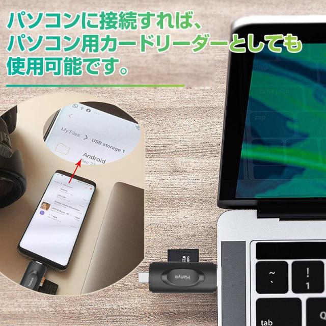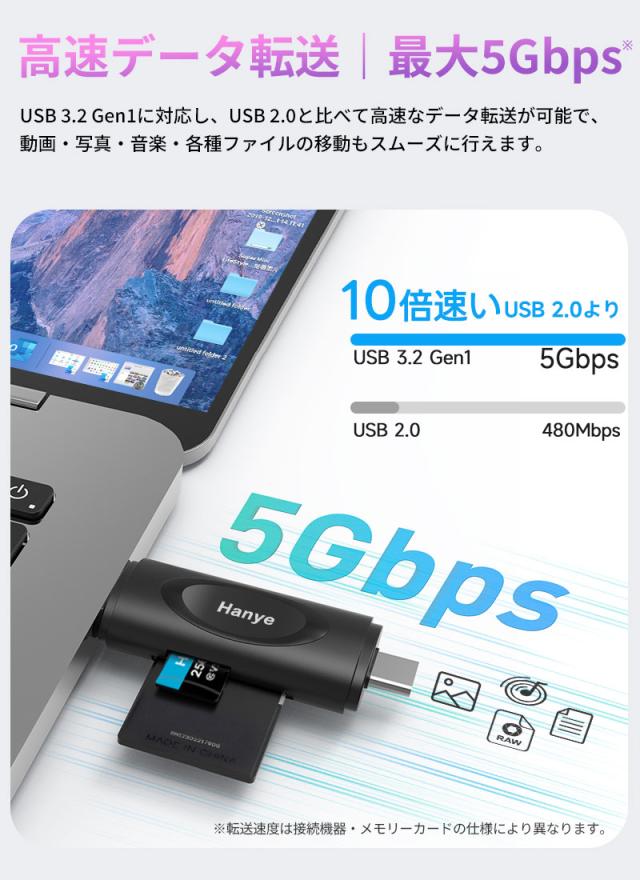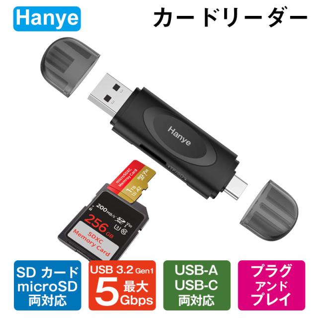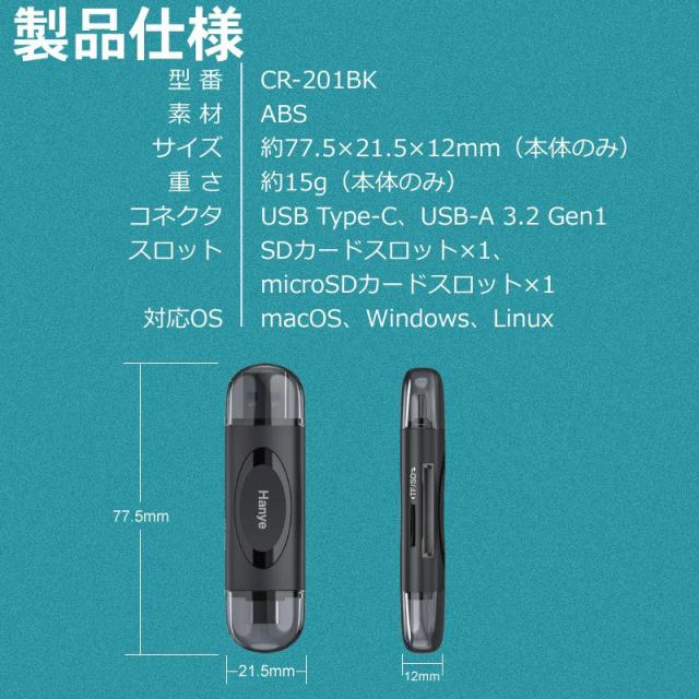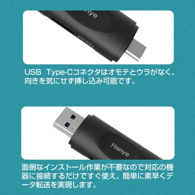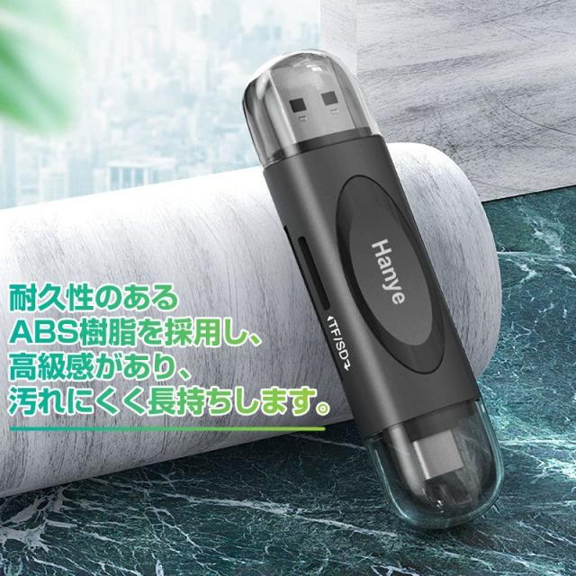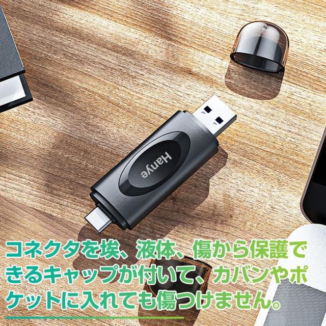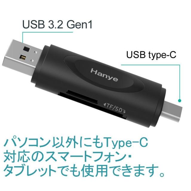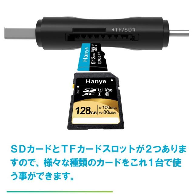 スマホをお使いで、容量不足でお困りのあなたに朗報!2つのUSBコネクタ(USB3.2 Gen1、USB type-C)を搭載するmicro SD/SDカード用カードリーダーです。USB3.2 Gen1インターフェースを備え、USB 2.0よりも10倍速くて5Gbpsまでの超高速データ転送をサポートし、動画や大量のHD写真もストレスのないデータ転送を提供しています。USB3.2 Gen1準拠ですが、USB2.0/USB1.1にも対応しています。 【type-C】、【USB3.2 Gen1】、【SDカード】と【 MicroSDカード】の組み合わせで、PCやOTG機能付きのタブレットPC及びAndroidスマートフォンのデータ確認・移行・バックアップの活用ができます。メモリ不足、データ転送の悩みを解決します。SD・micro SDカードを差し込んでデバイスとつなぎ、多彩なメディアを高速に読み書きや転送できます。USB Type-Cコネクタはオモテとウラがなく、向きを気にせず挿し込み可能です。USBポート経由で電源を供給し、面倒なインストール作業が不要なので対応の機器に接続するだけですぐ使え、簡単に素早くデータ転送を実現します。 耐久性のあるABS樹脂を採用し、高級感があり、汚れにくく長持ちします。コネクタを埃、液体、傷から保護できるキャップが付いて、カバンやポケットに入れても傷つけません。超軽量&コンパクトなデザインで持ち運びにやすく、日常生活や旅行や仕事など様々な場面で活躍します。外出先での使用に超便利!Windows、Mac OSおよびLinuxなどのシステムに対応します。最大512GBのメモリカードまで使えるから、これ一つで、スマホの容量不足の心配から解放されます!JPEGやGIF、MP4やM4Vなど幅広い形式のファイルの閲覧に対応しています。ネット環境がない場所での使用やスマートフォンの容量が少ないときのデータ保存時に便利です。