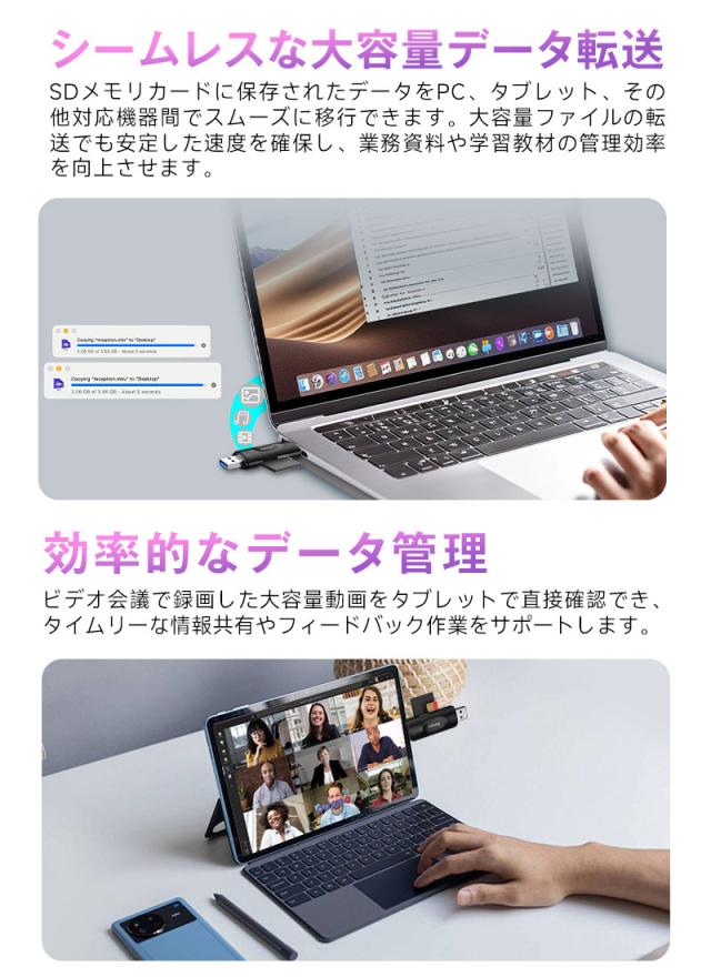 USB3.2 Gen1 SDカードリーダー 高速データ転送 容量不足 メモリー解消 2in1マルチカードリーダー USBマルチカードリーダー 写真 動画 音楽 データ移行 カードリーダー Micro SD/SDカード両対応 Type-C/USB接続 メモリーカードリーダー PC/Macbook/Android/タブレット対応 メモリカードリーダー type-c usb カードリーダー Type-C カードリーダー スマホ タブレット 2in1マルチカードリーダー USB3.2 Gen1/Type-c対応 SD microSD Android OTG機能 Type C Type-C カードリーダー Type-C USB3.2 Gen1 microSD SD マルチカードリーダー スマホ タブレットPC SDカード microSDカード カードリーダーライター MicroSDXC/MicroSDHC/MicroSD/SDXC/SDHC/SDカード対応