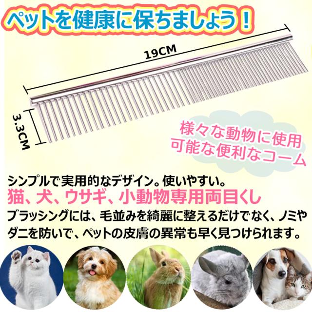 【商品説明】※粗目と細目が一体になった両目くしです!!※\愛犬・愛猫の毛並みのお手入れに! ! 一本で二役♪/ペットのグルーミングはこれ一本!洗練された設計で2種類の機能を搭載。粗目で毛をほぐし、細目で毛を整えることができます。クシ先が丸く、ペットの身体を傷つけることがありません。細目、粗目ともに綺麗にピンが揃っているので、プロトリマーに重宝されるコームとなっています。猫、犬、ウサギ、小動物専用両目くし。ブラッシングには、毛並みを綺麗に整えるだけでなく、ノミやダニを防いで、ペットの皮膚の異常も早く見つけられます。【商品仕様】パッケージ内容:ペットコーム×2色:シルバーサイズ:全長約190×幅35(mm)材質:スチール(先丸針)クロームメッキ※日本語説明書は付属しておりません※モニタにより若干色味が変化する場合がございます※輸入品ですので多少の臭いやスレ傷、汚れはご了承ください※サイズは実寸ですが若干前後する場合がございます===========※詳細は画像にてご確認ください
