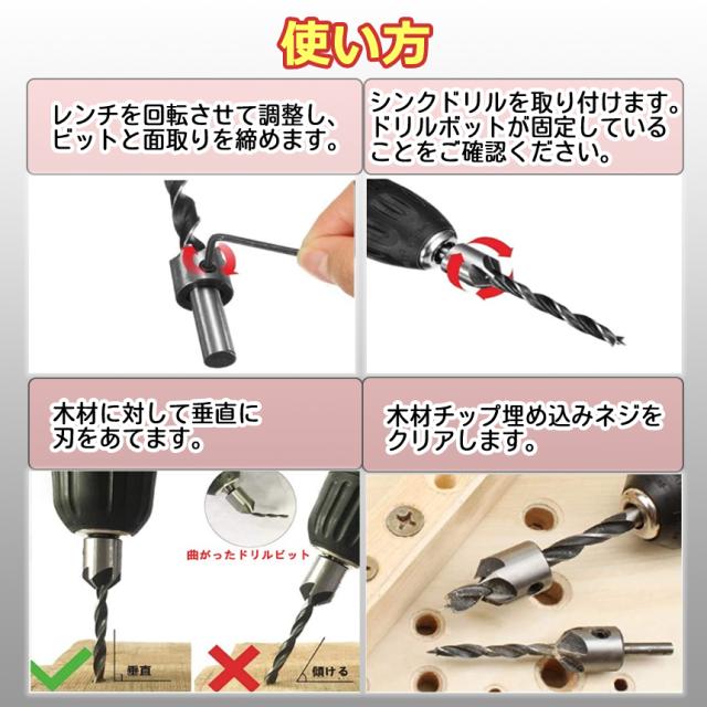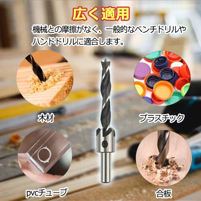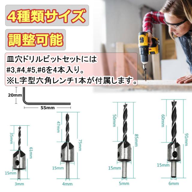 【4種類サイズ&調節可能】皿穴ドリルビット4本:3mm 4mm 5mm 6mm作業に便利な皿穴ドリルビットの4本セットで取付用六角レンチ付属!取付用六角レンチでドリル交換らくらくです。【鋭角先端&丸軸】木工用ドリルの先端が鋭角になり、刃もダブルツイストデザインで切削抵抗が軽く、スピードコントロールがしやすい錐形状です。六角軸を採用している為、トルクがかかるような場面でも安心!【理想的な面取りカッター】各種素材に対応する便利なドリルセットで、DIY、家材、建築材、アルミ板にも対応。ドリルビットと皿穴ビットの組み合わせは穴あけ、バリ取り、皿穴/長穴加工に最適です。サイズ:3mm、4mm、5mm、6mmドリル本体:45鋼特徴:穴拡大、バリ取りや長穴加工※ドリルの差し込みがあまい場合やドリルの回転スピードが速い場合では軸ズレが生じる場合がございます。必ず本番前に試して調節をしてからご利用下さい。※日本語説明書は付属しておりません。※詳細は画像にてご確認ください