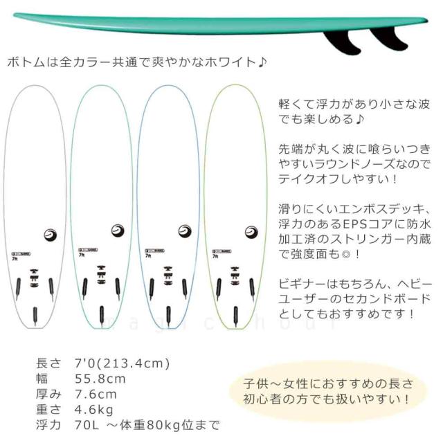 長さ 7フィート(213.4cm) / 幅 55.8cm / 厚み7.6cm / 重さ4.6kg / 浮力 70L