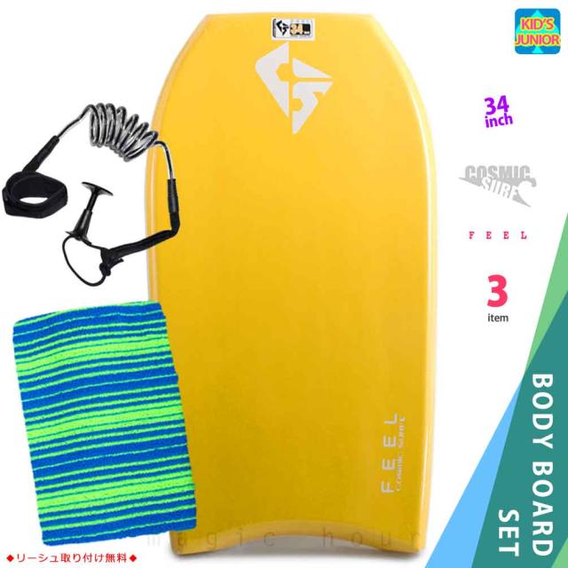 子供用 ボディボード 3点 セット キッズ ジュニア ボディーボード 34インチ ニットケース リーシュコード COSMIC SURF コスミックサーフ FEEL-JRSET3-YEL