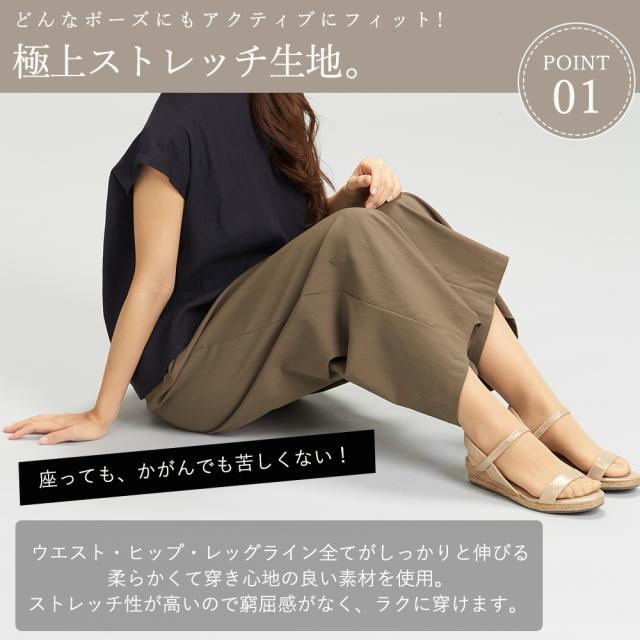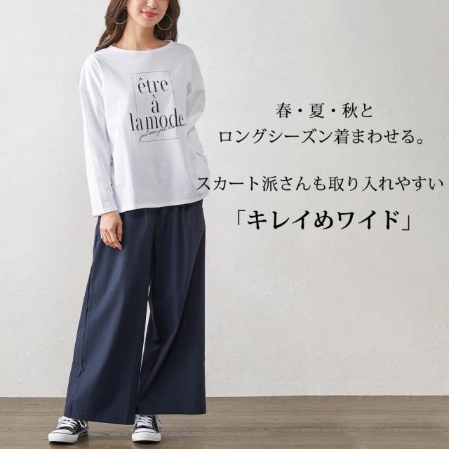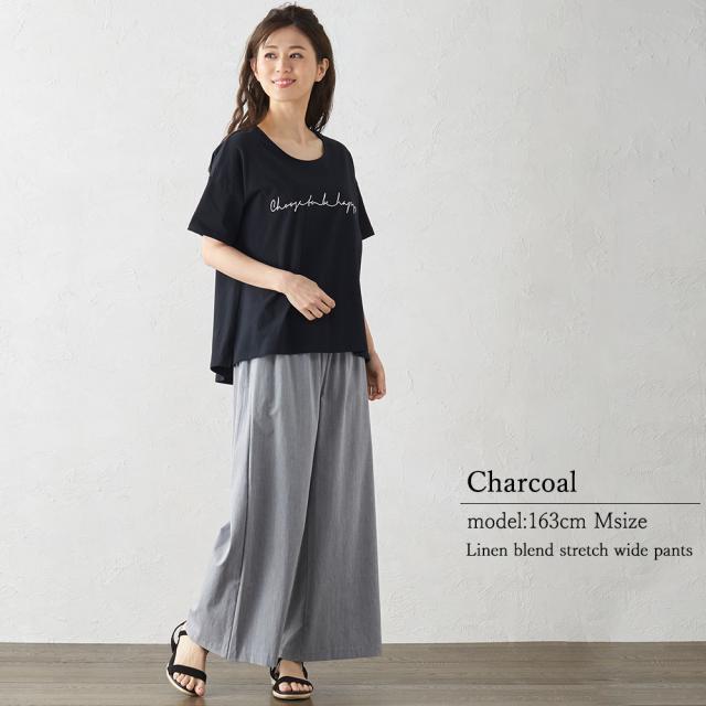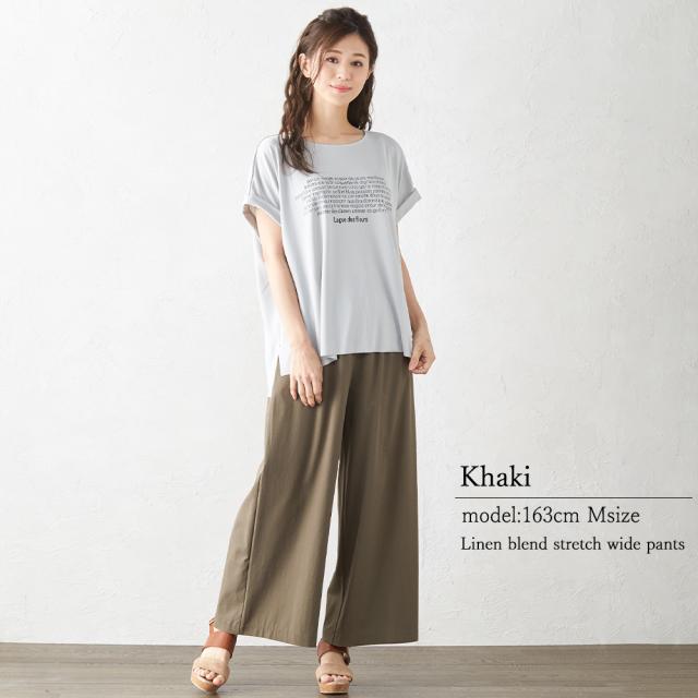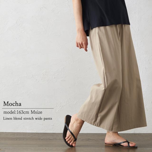日本製 レディース ワイドパンツ きれいめ シンプル 体系カバー リネン 麻混 ストレッチ素材 手洗い可能 ウエストゴム 楽ちん 美脚 通勤 春 夏 秋 全5色 ベージュ モカ カーキ ネイビー チャコールグレー ネコポス対応 送料無料
