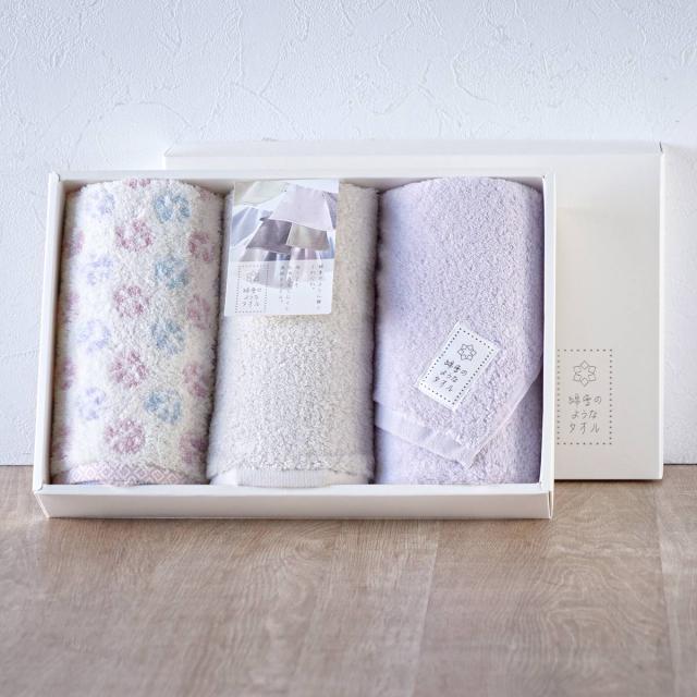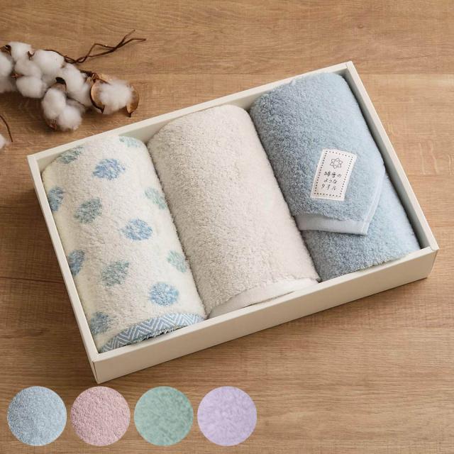 ふわふわな肌ざわりが特徴の「綿雪のようなタオル」シリーズ。無地タイプと柄タイプ、両方のタイプが一緒になったギフトセットがあり、用途に合わせてお好みのデザインやサイズをお選び頂けます。