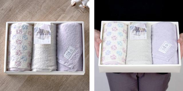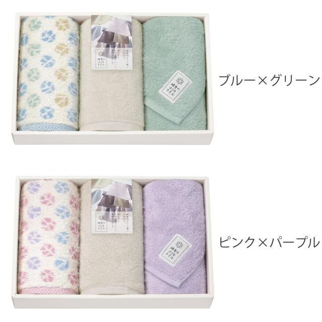 ![]() ギフトセット フェイスタオル・ハンドタオル:各1枚 | ![]() ギフトセット フェイスタオル2枚 | ![]() ギフトセット フェイスタオル3枚 |