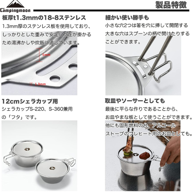 キャンピングムーン社のシェラカップ用の蓋です。ステンレス製でコースター、小型のトレーとしても使用できます。