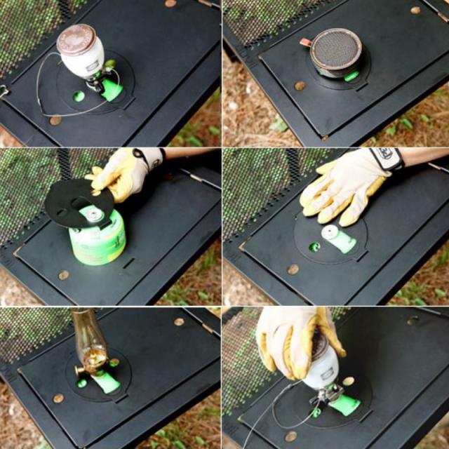テーブルの上でガスバーナーやガスランタンを固定して使用できます。