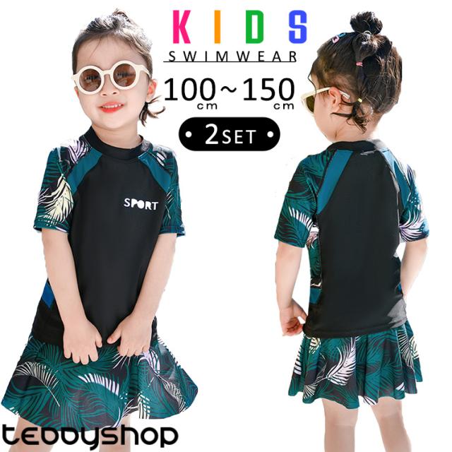 春新作 即納 キッズ 水着 半袖 セパレート 女の子 トップス スカート 2点セット おしゃれ 子供 子ども ベビー ジュニア 洋服風 黒 ボタニカル 100 110 120 130 140 150 水遊び プール 水泳 海 川 露出控えめ 紫外線対策 日焼け対策 パッド付き パッド