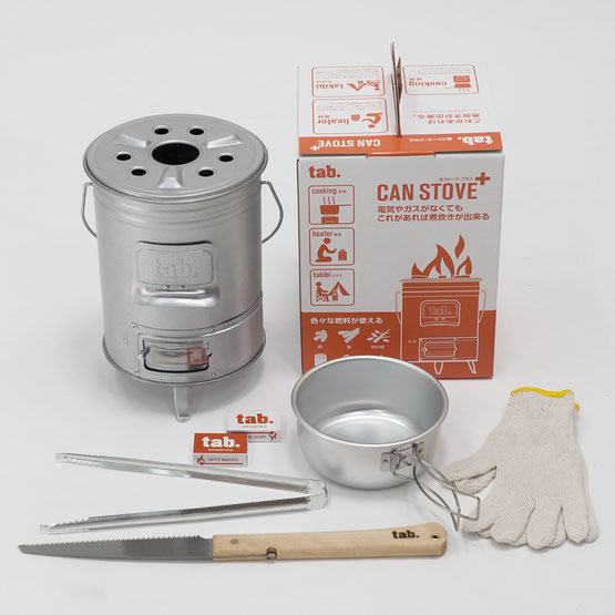 枯れ枝、木炭、練炭など色々な燃料が使えて着火も簡単「マルチに使える 缶ストーブ」に、いざという時に使えるアイテムをセットしました。