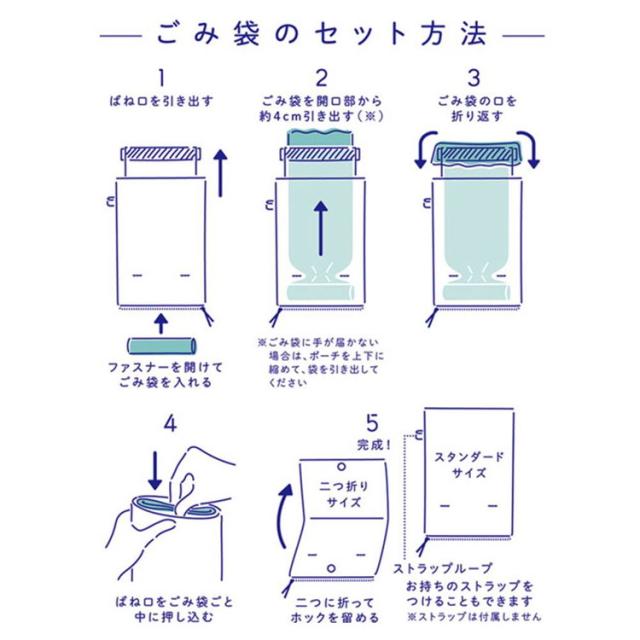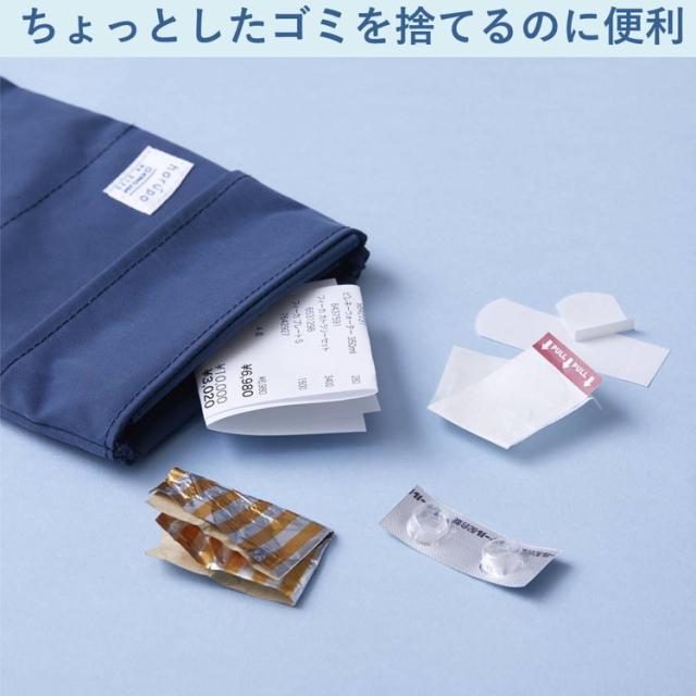 付属の専用ごみ袋をセットするので、ポーチやカバンの中が汚れず衛生的。ウェットティッシュなどの湿ったごみを捨てる時も安心です。本体にはミシン目付きのポーチから引き出してミシン目で切り取るだけのロール状のごみ袋が1ロール(20枚入り)付属しています。