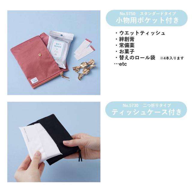 スタンダートサイズはウェットティッシュやマスクなどを一緒に収納可能。2つ折りサイズには、ポケットティッシュを入れられるティッシュケースが付いています。使用時に出たごみはそのまま捨てられて便利です。