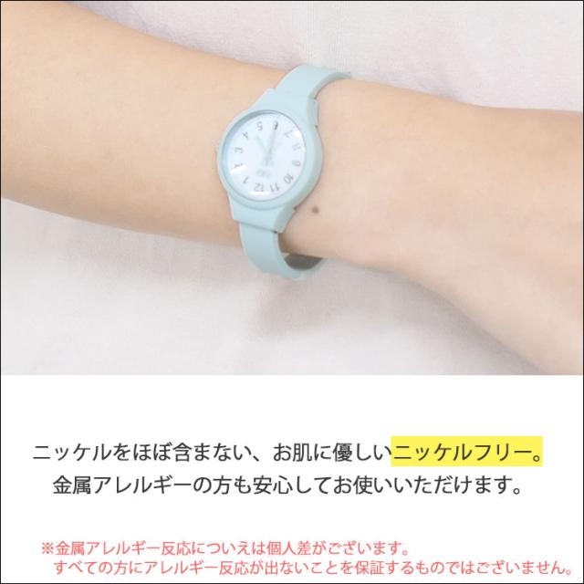 - 色も可愛いし、すぐに嵌めれて使い勝手がいい。 つけ外しすぐできるので短気な人とめんどくさがりにオススメ。肌触りもいいし、文字盤も見やすい。色違いが欲しい。