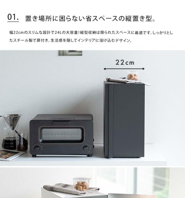 幅22cmのスリムな設計で24Lの大容量!縦型収納は限られたスペースに最適です。しっかりとしたスチール製で扉付き。生活感を隠してインテリアに溶け込むデザイン。