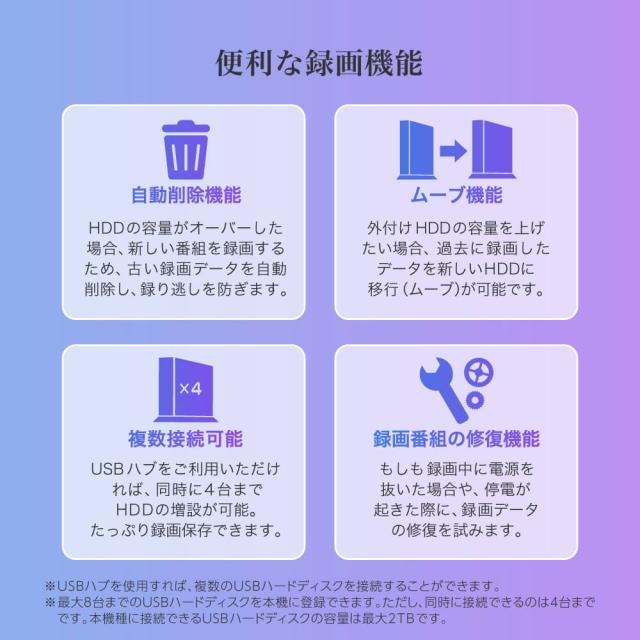 ※最大8台までのUSBハードディスクを本機に登録できます。ただし、同時に接続できるのは4台までです。本機種に接続できるUSBハードディスクの容量は最大2TBです。