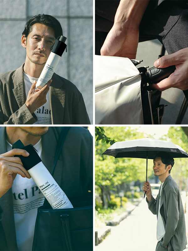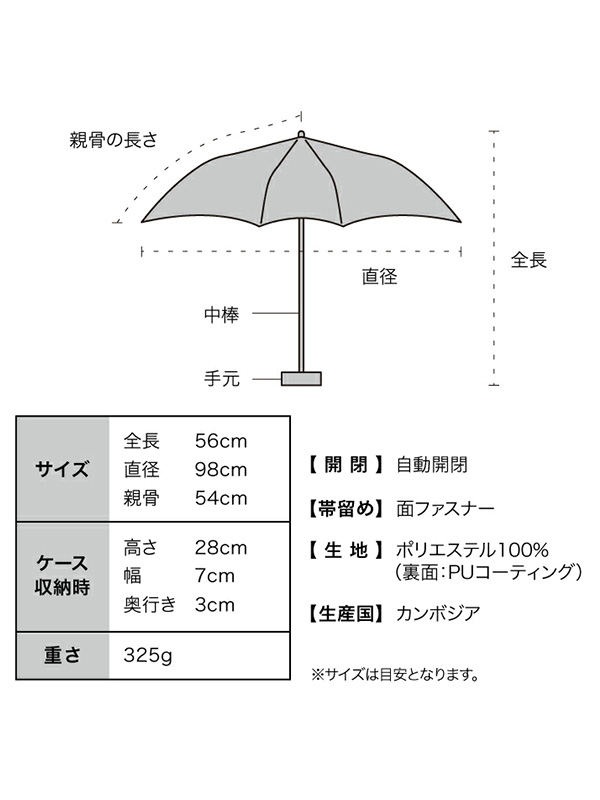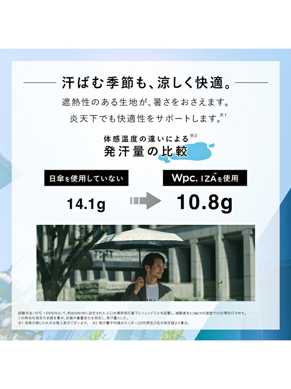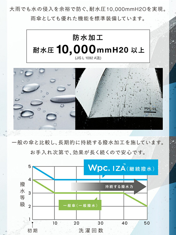 Wpc. IZA Type:Automatic & Safe Umbrella Wpc. IZA Type:Automatic & Safe 折りたたみ傘 【Wpc(ダブルピーシー)】 「新たな可能性を生み出す」をスローガンに2004年に誕生したドメスティックブランド。 様々な世代・ジャンルに合った方へ、雨の日だけでなく、天気によって変わる”ライフスタイリング”を提案していきます。 そして。ご愛用いただけるお客様の毎日が楽しくなる製品をお届けします。 【AUTOMATIC & SAFE】 荷物の多い日でも片手で操作できる自動開閉設計。 安全自動開閉(AUTO SAFETY CLOSURE)システムを採用。 一般的な自動開閉式折りたたみ傘はシャフトを縮める際、一気に押し込まなければ スプリングの力で押し戻されてしまいますが、この傘は特殊な構造により、 押し戻されることなく少しずつ段階的に収納でき、安全にご使用いただけます。 【暑さを凌いで、クールな日常へ。】 ■体感温度を下げる≪遮熱性≫ 生地裏面のコーティングにより、圧倒的な遮熱効果を発揮。 炎天下でも、体感温度が大幅に下がります。 ?日傘を使用していない場合の頭頂部の表面温度:約52.8℃ ?Wpc. IZA を使用した場合の頭頂部の表面温度:約38.1℃ ※製品の使い方、気象条件や路面からの輻射熱、風や温度などの影響により、遮熱効果は異なります。 ※環境:室温25℃×60%RH 照射強度:約800W/?u(JIS L 1951遮熱試験同様強度)試験試料:オフ色/ポリエステル100%裏面PUコーティング/親骨サイズ55cm ■夏の大敵≪汗を抑える≫ 体感温度が下がることで、汗の量も大幅に低減。 汗ジミなどを抑えて快適に過ごせます。 ?日傘を使用していない場合の発汗量:14.1g ?Wpc. IZA を使用した場合の発汗量:10.8g ※効果の感じられ方は個人差がございます。 ※発汗量平均値はモニター(20代男性)3名の測定値により算出。 ※試験方法:室温25℃×60%RHにて、約800W/?uに設定された人工太陽照明灯直下にトレッドミルを設置し、 被験者を4.0km/hの速度で20分間歩行させた。この時当社指定の衣服を着せ、衣服の重量変化を測定し、発汗量とした。 ■日焼け・紫外線から守る≪完全遮光≫ 遮光率&UVカット率100%の生地を採用。 UPF50+(紫外線保護指数)も最高値を獲得。 ※記載の遮光率・UVカット率・UPF値は生地の状態での測定値です。傘本体の性能を示す数値ではございません。 また、生地に施された刺繍・縫製などUV加工生地以外の部分もその限りではありません。 【雨の日にも、万全の備えを。】 ■最高等級の≪撥水力≫ 生地表面に施した加工により、最高等級5級の撥水性を実現。水滴が転がりやすく、雨の日のストレスを軽減します。 さらに、一般の傘と比較し長期的に持続する撥水加工を施しています。 ※傘の通常使用を想定し、傘生地の洗濯試験を10回〜50回実施し、撥水性能を比較したものです。 ※当社比較 ※洗濯試験:家庭用洗濯機による洗濯試験、1回5分実施 撥水等級:最高レベルを5級、最低レベルを1級とした撥水性の等級 ■大雨にも耐える≪耐水性≫ 大雨でも安心な、耐水圧10,000?oH2O実現した生地を使用。 ※激しい雨や長時間の雨傘としてのご使用は、雨漏りや生地に水がしみ込む恐れがございます。 またデザインの特性上、完全な防水はっ水加工が難しい場合があり、雨が染み込むことがありますのでご注意ください。 ≪開閉方法≫ 安全自動開閉(AUTO SAFETY CLOSURE ) ワンタッチで傘を開き、骨を閉じることができるため、 荷物が多い日や車で移動する時などに非常に便利です。 一般的な自動開閉式折りたたみ傘はシャフトを縮める際、一気に押し込まなければスプリングの力で 押し戻されてしまいますが、この傘の特徴的な構造により押し戻されることなく少しずつ段階的に収納でき安全にご使用いただけます。 -操作方法- 傘を開く際は、帯をほどいて傘を少し振ってほぐした上で手元のボタンを押してください。 傘が自動で開きます。 閉じる際はボタンを押すと骨が縮みますので、その後傘の頭になる部分を段階的に押して、 カチッと音が鳴るまでしっかりと中棒を収納してください。 ※ボタンの操作を誤ると故障につながる恐れがございます。ご使用前に必ず付属の説明をお読みください。 ご使用になる前に製品に付属しているご使用上の注意をお読みください。 | ||||||||||||