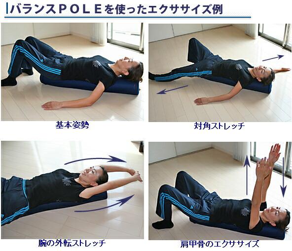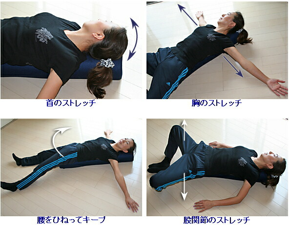 まずはこのポールを床に置いて、足は肩幅程度、手は自然に力を抜いて上に仰向けに寝てみて下さい⇒これだけでも背筋がピンと伸び、胸が張ってストレッチ運動に♪