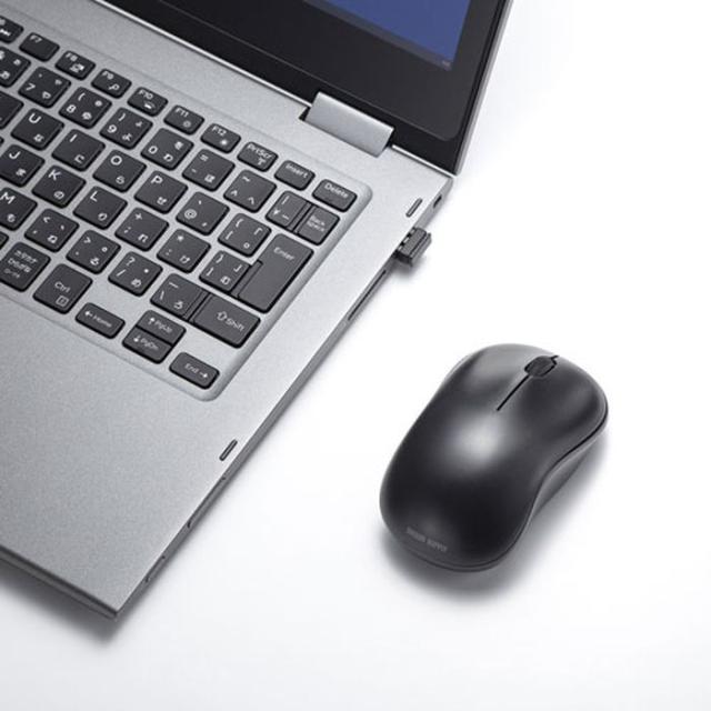 スタンダードな3ボタンのワイヤレスマウスです。ケーブルを気にせず使えるワイヤレスタイプです。電波障害に強い2.4GHzデジタル帯で、通信範囲が半径10mの広範囲で安定したデータ通信が可能です。14.7×19.1mmの極小レシーバーなので、ポート装着時の出っぱりが小さく、ノートパソコンにレシーバーを装着したままの持ち運びや保管にも邪魔になりません。マウス本体にレシーバーを収納できるので、紛失の心配がありません。開梱しやすく、開梱後のゴミを減らすことができる紙箱パッケージです。<ご注意>※鏡など光を反射する素材や、ガラスなど透明な素材の上でご使用になると、カーソルがスムーズに動かない場合があります。また、規則正しいパターンの上ではトラッキング能力が低下する場合があります。