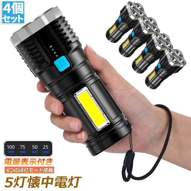 懐中電灯 4個セット 作業灯 LED 充電式 強力 高輝度 防災 地震 高輝度 ハンディライト COBライト 電力表示 大容量電池 IPX6防水 4モード 停電対策 登山 夜釣り 夜間訓練 作業灯