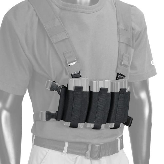 M4のマガジンが3本収納可能なマイクロチェストリグ用パネル。マイクロチェストリグのフロントパネルのみを交換することで様々な状況や装備に合わせられます。伸縮式のポーチになっており様々な種類のマガジンをしっかり保持します。モジュラーパネル対応のプレートキャリアにも使用可能。