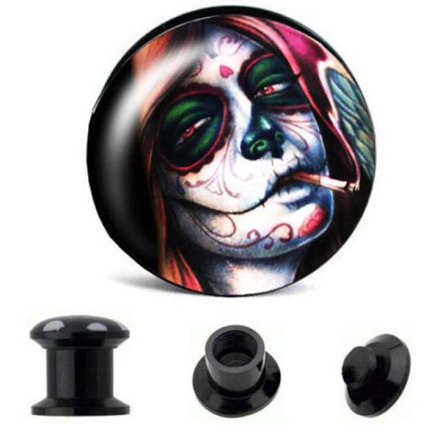 ダブルフレアの黒のアクリルプラグにメキシコの死者の祭りのメイクをしたスカルレディをモチーフにしたネジタイプのボディピアス。 ハロウインのコスプレや仮装にも使えそうな骸骨婦人のようなデザインのボディーピアス!