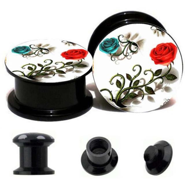 ダブルフレアの黒のアクリルプラグに白地に赤いレッドローズと青いブルーローズをデザインしたネジタイプのボディピアス。 ホワイトのキャンパスに赤いバラと青い薔薇が目立つボディーピアス! 男の人からも女の人からも人気のブラックアクリルボディピアス。 トンネル型のボディピアスのようにネジ式のダブルフレアなので、インサーションテーパーや拡張器がなくても装着も簡単なプラグです。